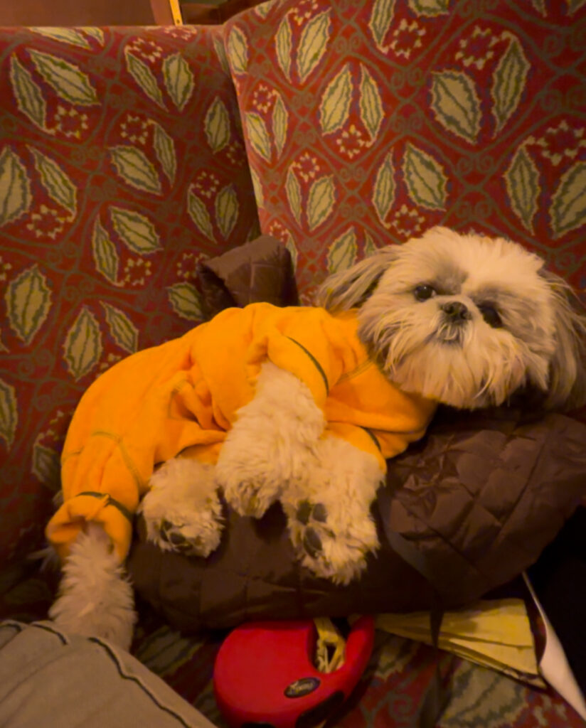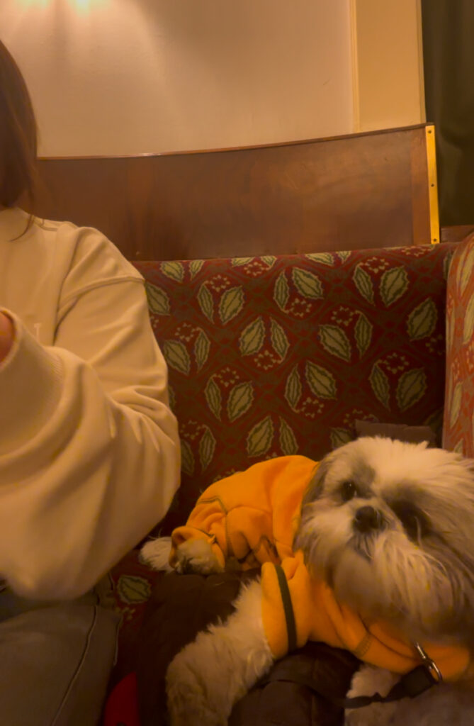 We were given a booth, and this is where the queen moment happened. Daisy sat up in the booth like she owned the place, surveying the room for a solid five minutes before eventually lying down. Every now and then she would wake up, check if there was food worth eating, and then go back to sleep. Staff came over specifically to say hello to her. Other diners stopped by the table to pet her. She was wearing her yellow onesie, which I think did a lot of the heavy lifting in the attention department.