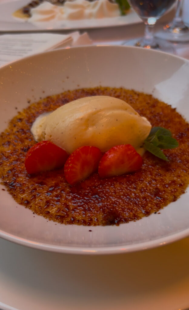 The menu was different from what I would normally order. We went with the beef soup with baked liver dumpling, which sounds unusual but was incredible. The broth was rich and warming, the dumpling was perfectly cooked, and it was exactly what you want after hours of walking in December cold. For dessert I had crème brûlée and Auntie Cheryl had a crêpe. Both were delicious.