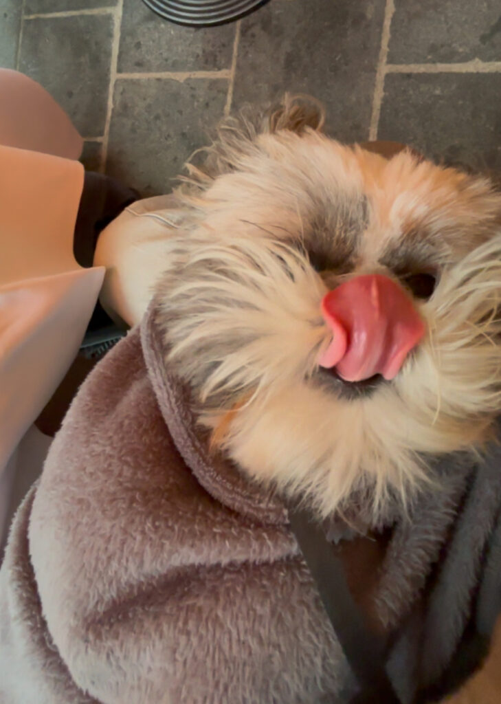 We waited about 20 minutes for a table outside. It was freezing, so we used the blankets they provided, which Daisy immediately claimed. She wrapped herself into a burrito shape and was out cold for most of the meal, waking up only when the soup arrived for a curious sniff and taste.