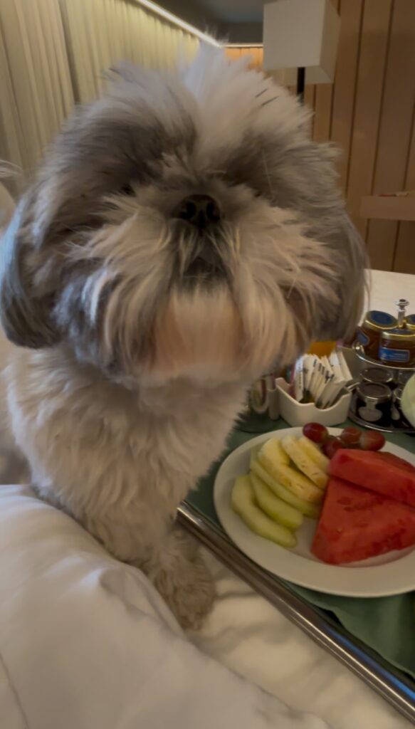 Here’s a little insider tip: Mom booked through our own travel agency last minute, and there wasn’t a direct way to mention they were bringing the most fabulous Shih Tzu in existence (that’s me). But honestly? Zero problem. Within minutes of reaching our room – which, by the way, we scored a complimentary upgrade on – the hotel sent up a dog bed, food and water bowls, and a generous bag of treats.